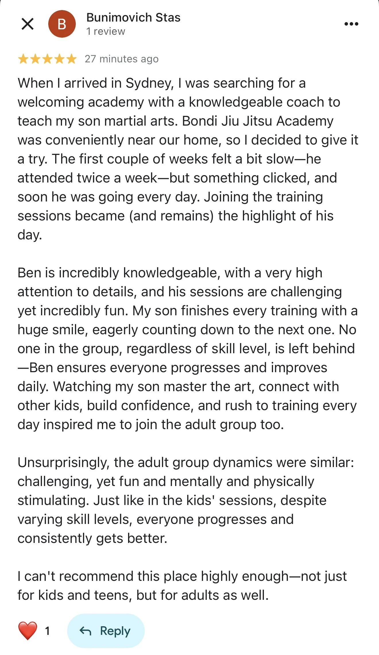My child has been practicing Jiu-Jitsu in Japan, and we were looking for a place in Bondi where they could continue their training. Thankfully, this academy welcomed us warmly. The lesson started with teaching a sequence of movements, and then the kids practiced those movements in different scenarios to really learn them. The explanations were very clear, and the instructors paid close attention to our child, which made us feel very comfortable joining for the first time. The class was lively with a good number of students, which also created a great atmosphere. We are very grateful to Ben for welcoming us so kindly. Highly recommended!https://maps.app.goo.gl/GjU3NHswRqAjwRBk6?g_st=ic