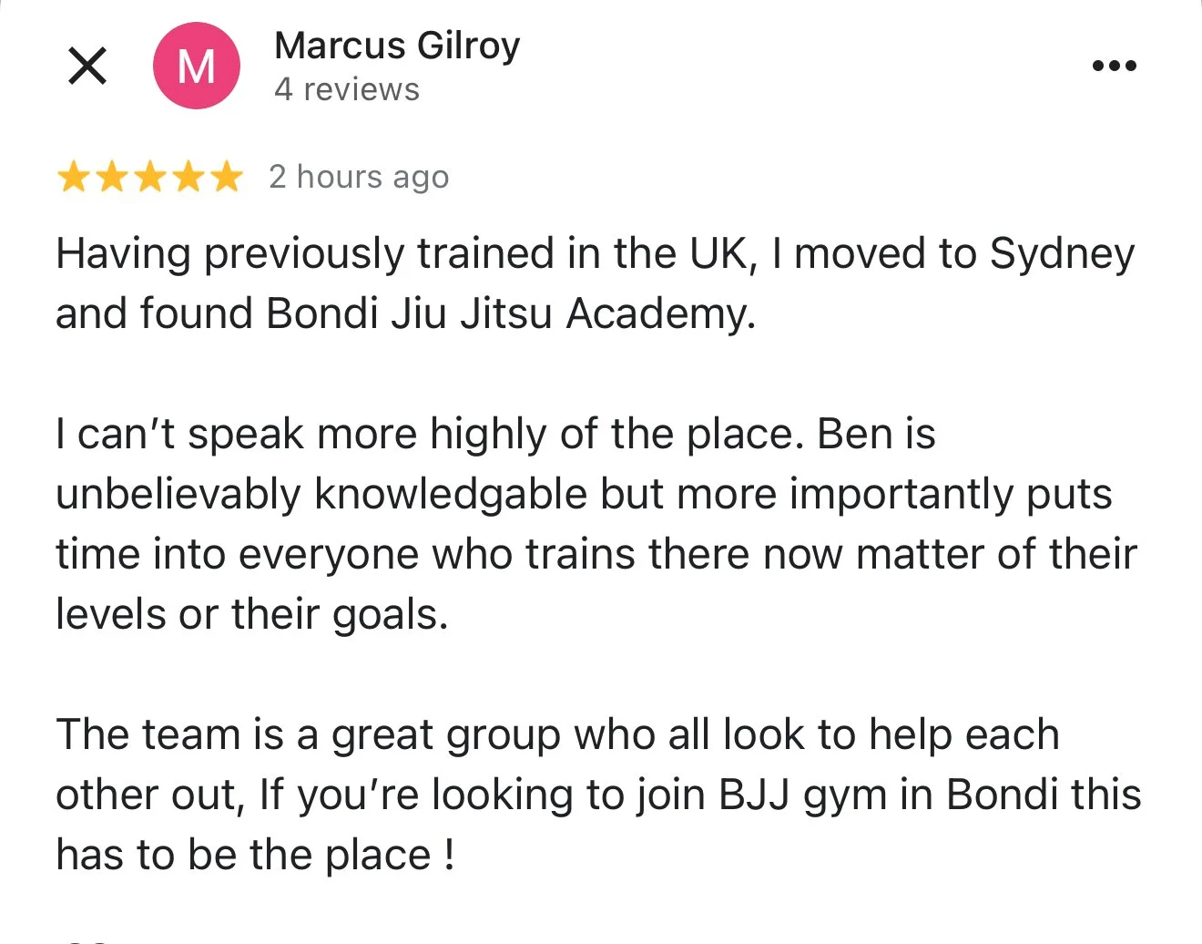 If you're in Sydney and looking for a gym to train at, I couldn't recommend Bondi BJJ enough. Great coach, cracking group of lads, and an atmosphere that makes you want to keep coming back. I'll definitely be back next time I'm in town.